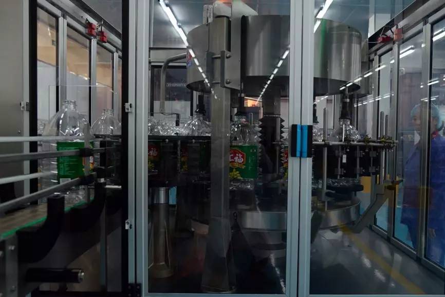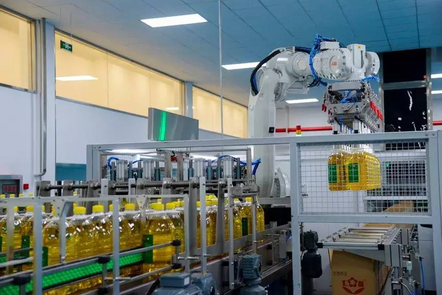 接着,就到装瓶阶段了,一个个瓶子在生产线上被机器人整齐划一地制作,再由灌瓶器将小黄油注入瓶中,满满的油瓶大腹便便得走出工作台坐着小火车,被裹上了新衣,套上了帽子,井然有序地来到装箱车间。